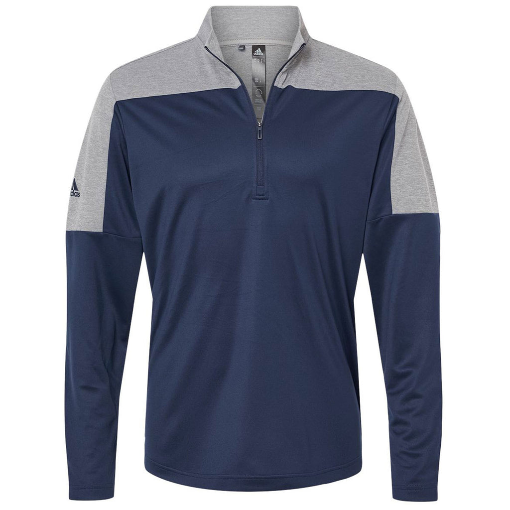 The adidas Men's Collegiate Navy/Grey Three Melange Lightweight Quarter Zip Pullover will show off your company's custom logo or design like no other hooded sweatshirt can. The two-toned design will set your team apart in the best way possible. Special moisture-wicking fabric makes it great for athletes or anyone with an active lifestyle.
