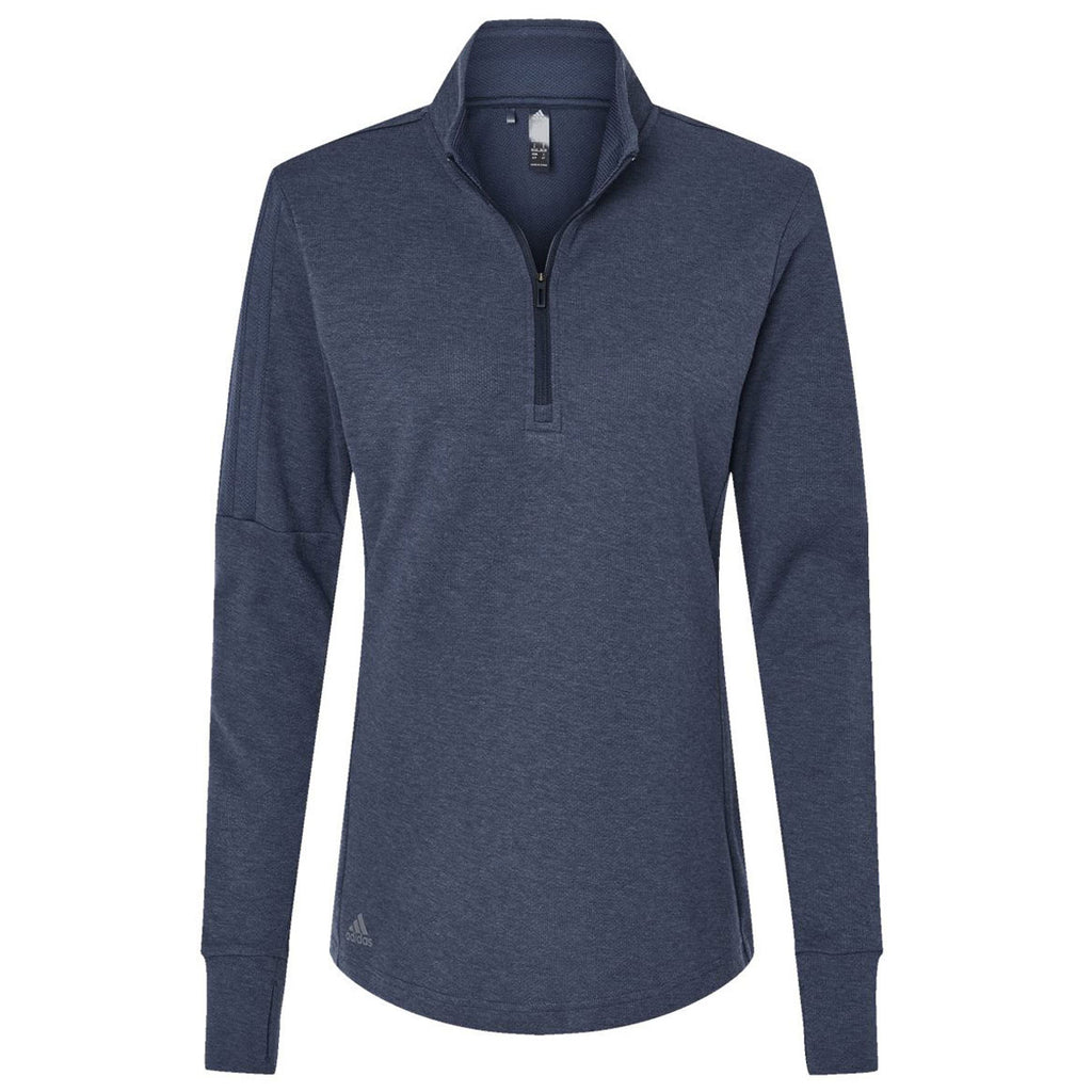 Women who love getting active will appreciate the functionality of the adidas Women's Collegiate Navy Melance 3-Stripes Quarter Zip Pullover. Made from a special moisture-wicking fabric, this hooded sweatshirt features a sleek silhouette and a variety of on-trend color options. All it's missing is your company's custom logo or design.