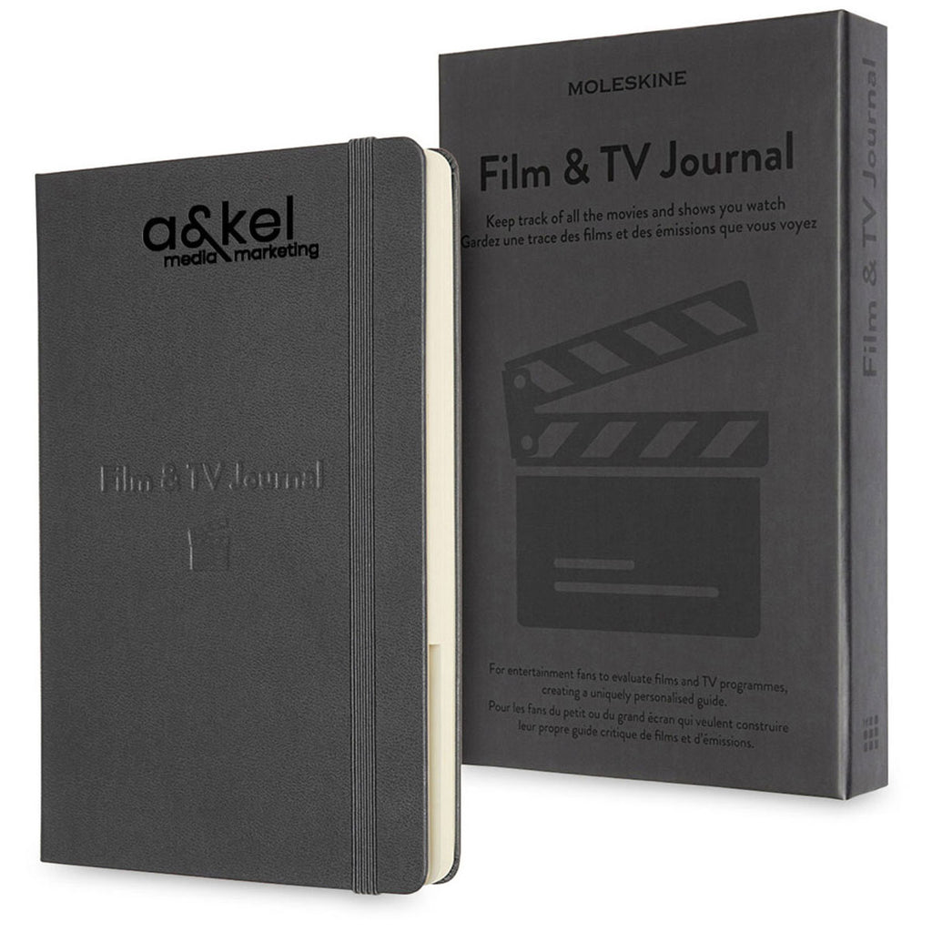 The logoed Moleskine Grey Passion Journal - Film & TV is a unique way to help others keep track of important moments that are attached to television and film. These are perfect for anyone who is passionate about what they watch. Add a custom logo to the journal to give as a gift at trade shows or to a film student who is part of your life. Try out a company logo to use these unique journals as an event giveaway or as employee gifts. The journal is split into three distinct sections: Watchlist and Favorites, Movies, and TV. Two ribbon bookmarks and a double expandable inner pocket keep everything right where it needs to be before you record your thoughts.The minimum order for this product is 12 pieces.