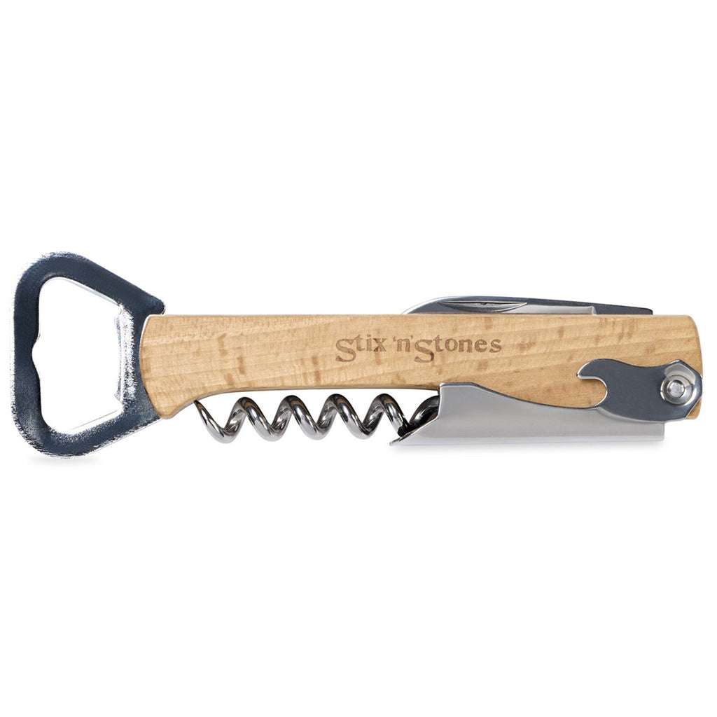 - This 4-in-1 wood bottle opener is a versatile tool with a corkscrew, two bottle openers, a can opener, and a knife