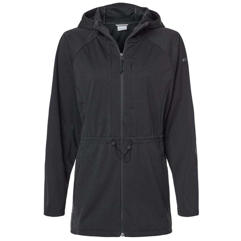Columbia Women's Black Flora Park Soft Shell Jacket with a custom design is a classy way to look and feel great. The advanced repellency, breathable, windproof jacket has a drop tail for extra coverage and an adjustable hood for when the weather takes a turn. Great for work, running errands, and going out.This product cannot ship outside of the United States.
