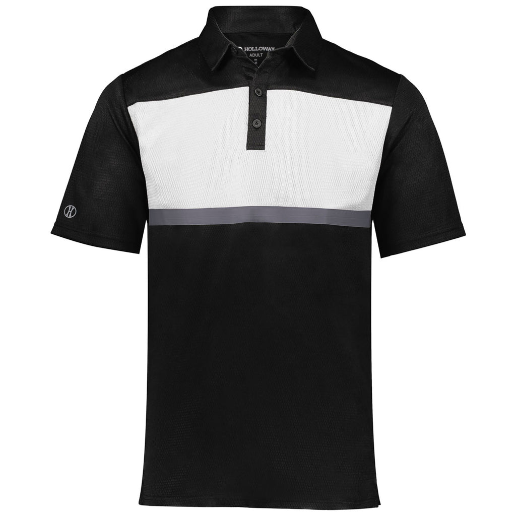 Holloway Men's Black/White Prism Bold Polo with embroidery is a must have for those who want to get noticed. The lightweight polyester wicking honeycomb knit has a bold look with a solid base and large block print on the chest in a complementary color. Created for the outdoors, this short sleeve polo has a UPF of 50+ and side vents to keep you cooler and provide fit. Add a company logo to use as employee apparel or something custom to use while enjoying a round of golf with friends. The three-button placket and self-fabric collar bring together this look that can go from the boardroom to the bar with ease. Place an order today.Corresponding Women's Style:Holloway Women's Black/White Prism Bold Polo