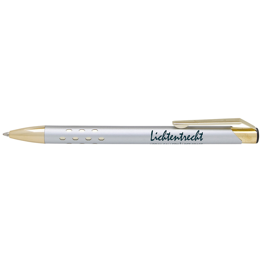 Souvenir Silver Armor Gold Pen with your logo makes a perfect gift for special occasions. The high-style matte metallic writing instrument features elegant gold trim, and InstaGlide upgraded hybrid ink for a superior writing experience. It is perfect for new hires, graduates, and special signing events. Order today.The minimum order for this product is 100 pieces.