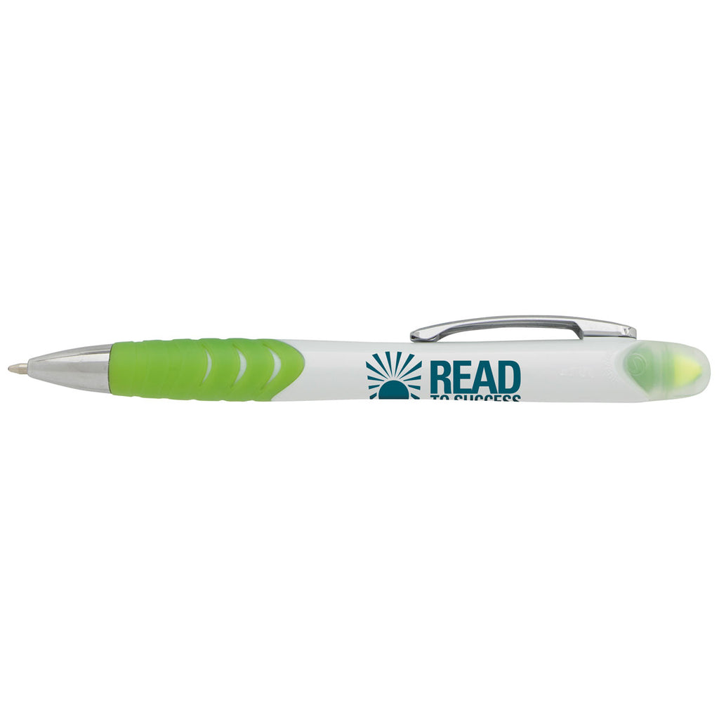 Enjoy a branded Souvenir Lime Jalan Highlighter Pen Combo that both advertises your company and serves a useful purpose. The straightforward white barrel makes sure your corporate logo is boldly displayed and the brightly colored grip helps draw the eye. A capped highlighter top offers dual colors to create a multi-use design. Perfect as part of an event giveaway or to draw attention at a trade show, this pen and highlighter combo is a must have. Choose your custom logo and place an order for these today to restock your office supplies and have a quick option for a prize when needed.