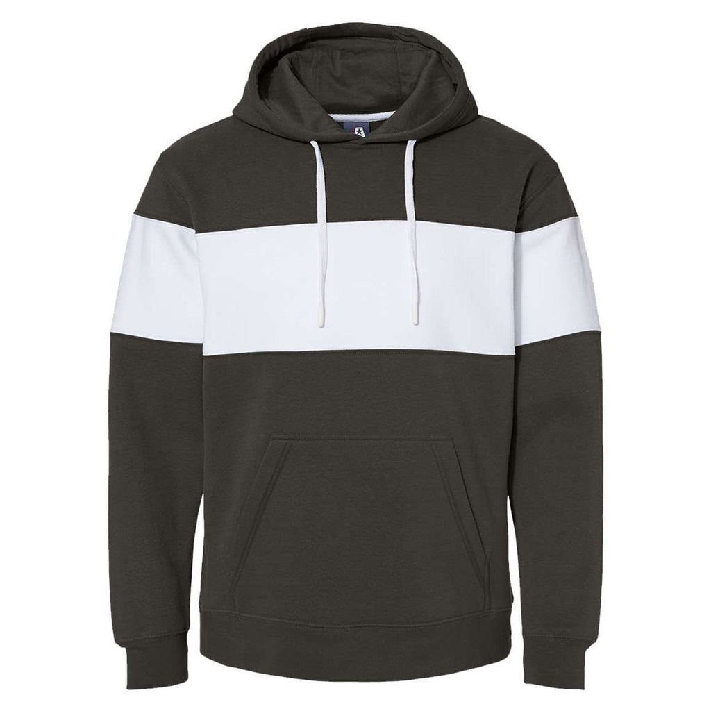 Stand out with embroidery on the J. America Men's Black Varsity Fleece Colorblocked Hooded Sweatshirt. Choose a custom logo to create team or warm-up gear that will get noticed with a solid bottom, top and shoulders and large colorblocked stripe across the chest. A drawstring hood with contrasting drawstring protects from the wind when needed on this easy to layer hooded sweatshirt that nearly anyone can enjoy. Ideal as an employee gift with a company logo or a custom gift for friends, this sweatshirt makes those long days at home, outdoors, or running errand much more comfortable.Corresponding Women's Style:J. America Women's Black Varsity Fleece Piped Hooded Sweatshirt