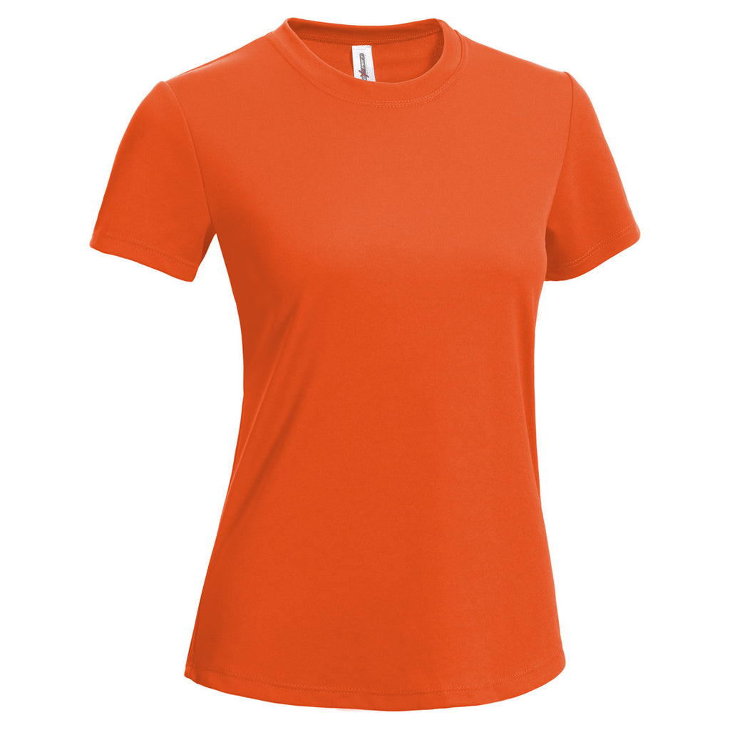 Expert Women's Safety Orange Short Sleeve Tee features short sleeves, crew neck and crafted from 100% microfiber polyester, available in a range of hues. Perfect for everyday wear or the most intense workouts, this tee comes in a relaxed fit in feminine contoured design. Soft, breathable fabric expertly wicks sweat to keep you as dry as possible. Treated with BodyFreshe to eliminate odors and inhibit odor-causing bacteria. Promote a healthy and active lifestyle with these workout-ready shirts, ready to sport custom logo imprint of your company.The minimum order for this product is 12 pieces.