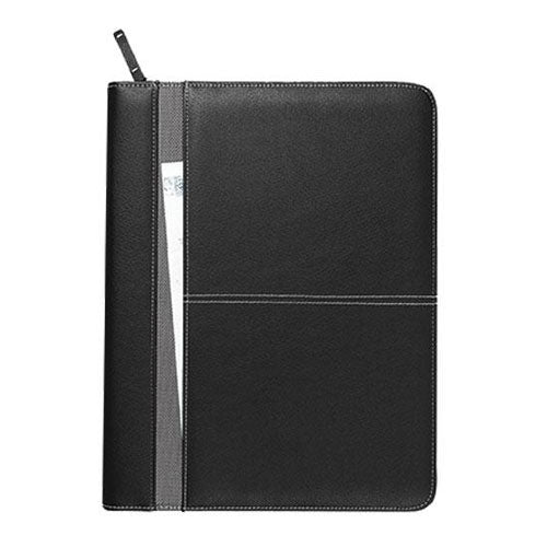 Stay organized and generate leads at the same time with this leather-like customizable padfolio. The Atchison Black Monticello Padfolio ensures all your important deals close in style thanks to its elegant design. It features an integrated pocket to hold business cards, calculator pocket, exterior slip pocket and zippered closure on main body, along with an 8.5x11" writing pad.