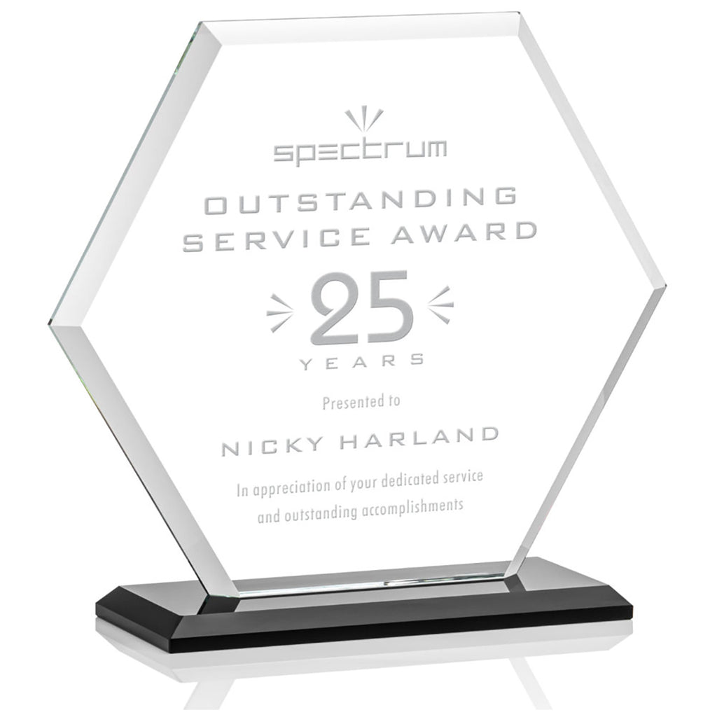 St. Regis Black Barnett Award 8" x 8.25" x 3" - Laser Engraved with a custom message comes in multiple sizes to fit your special awards ceremony needs. The beveled Starfire Crystal hexagon is mounted on your choice of bases. Perfect to recognize outstanding service, anniversaries, or anything you choose. Order before your next event.