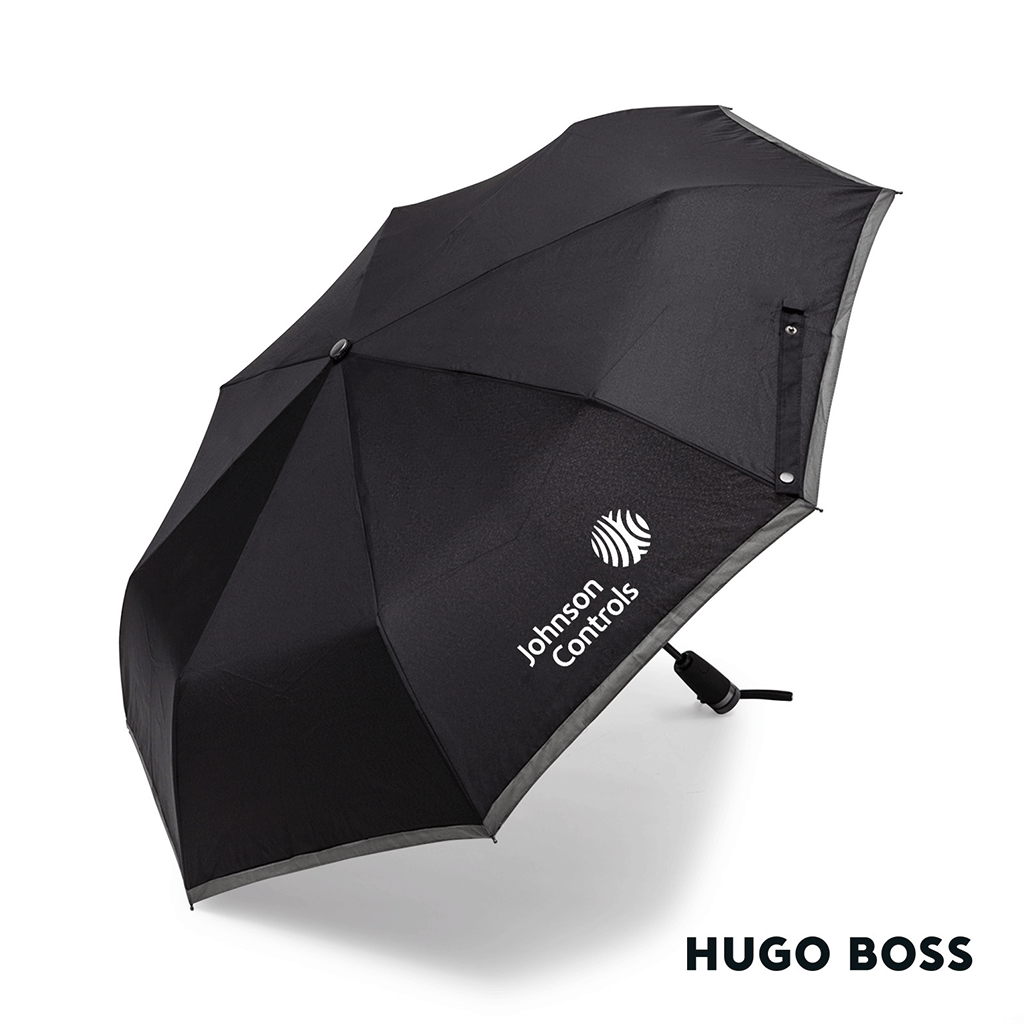 The Hugo Boss Black Gear Pocket Umbrella is distinguished by its modern and trendy look. The handle has a rubber finish with a contrasting color ring and a signed serrated tip. The canvas is double-toned with a brightly colored edging for a distinctive style. This umbrella is lightweight, supplied in a signed zip pocket and the opening/closing is automatic for optimal comfort.