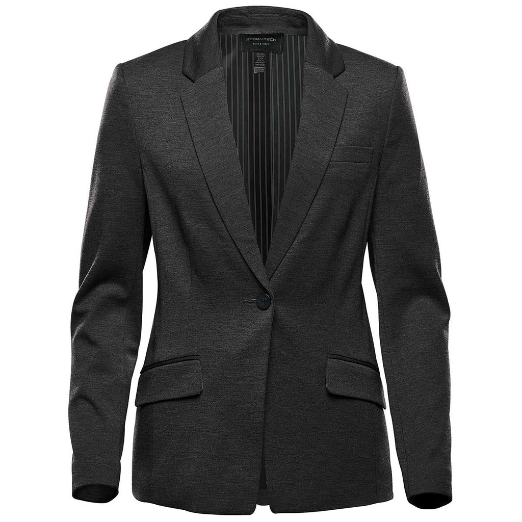 Corporate apparel has never looked better than the Stormtech Women's Black Delano Knit Blazer. The form fitting, princess cut blazer is highly versatile with notched lapel collar, functional pockets, and high-quality lining. Add a company logo to use as employee apparel or add to your wardrobe. Easily go from day to night as this blazer can be paired with a tank or nice dress shirt for multiple looks. This blazer will have you feeling as professional as you look at a great price.Highlights