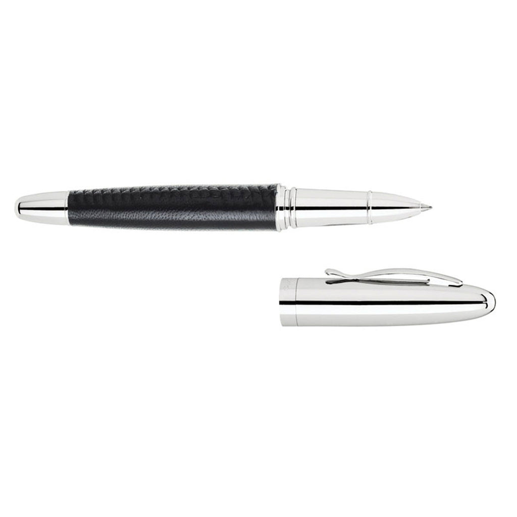 Owing to its sleek simplicity and rigorous design, Avante Bettoni Black Rollerball Pen will quickly become a preferred addition to your collection of writing instruments. It features a leather barrel and a brass cap accented with chrome finish. It can be customized with a custom logo to represent company or organization.