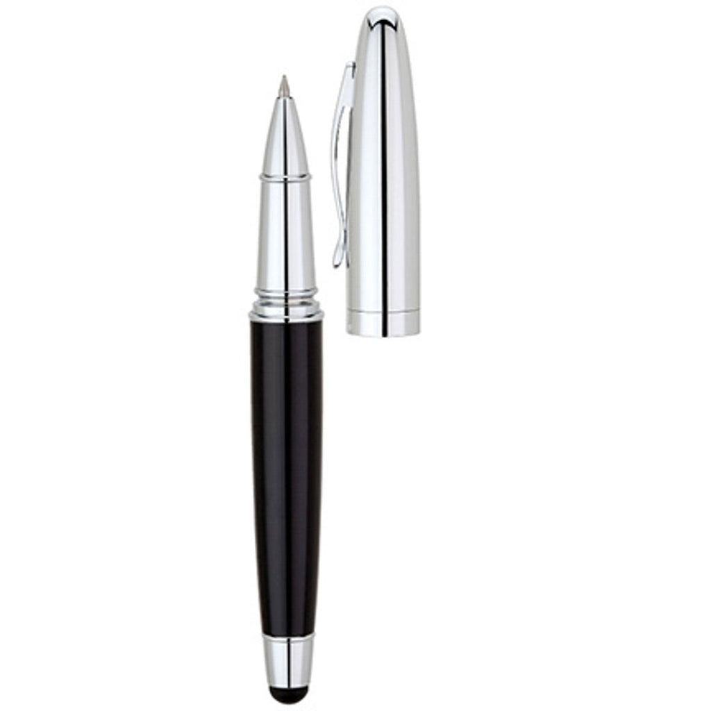 From the company executives to prospective customers and tradeshow visitors to potential customers, the Bettoni Black Brescia Rollerball Pen & Stylus is the perfect custom logo gift to impress anyone! Highlights include a glossy body, chrome accents and a capacitive stylus that works with touchscreen devices. Don't let them leave empty-handed; give out this rollerball pen at any event.The minimum order for this product is 50 pieces.