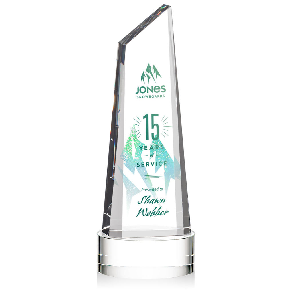 • Stunning trapezoidal tower VividPrint award is anchored with a thick optical crystal bottom that tapers to a peak.