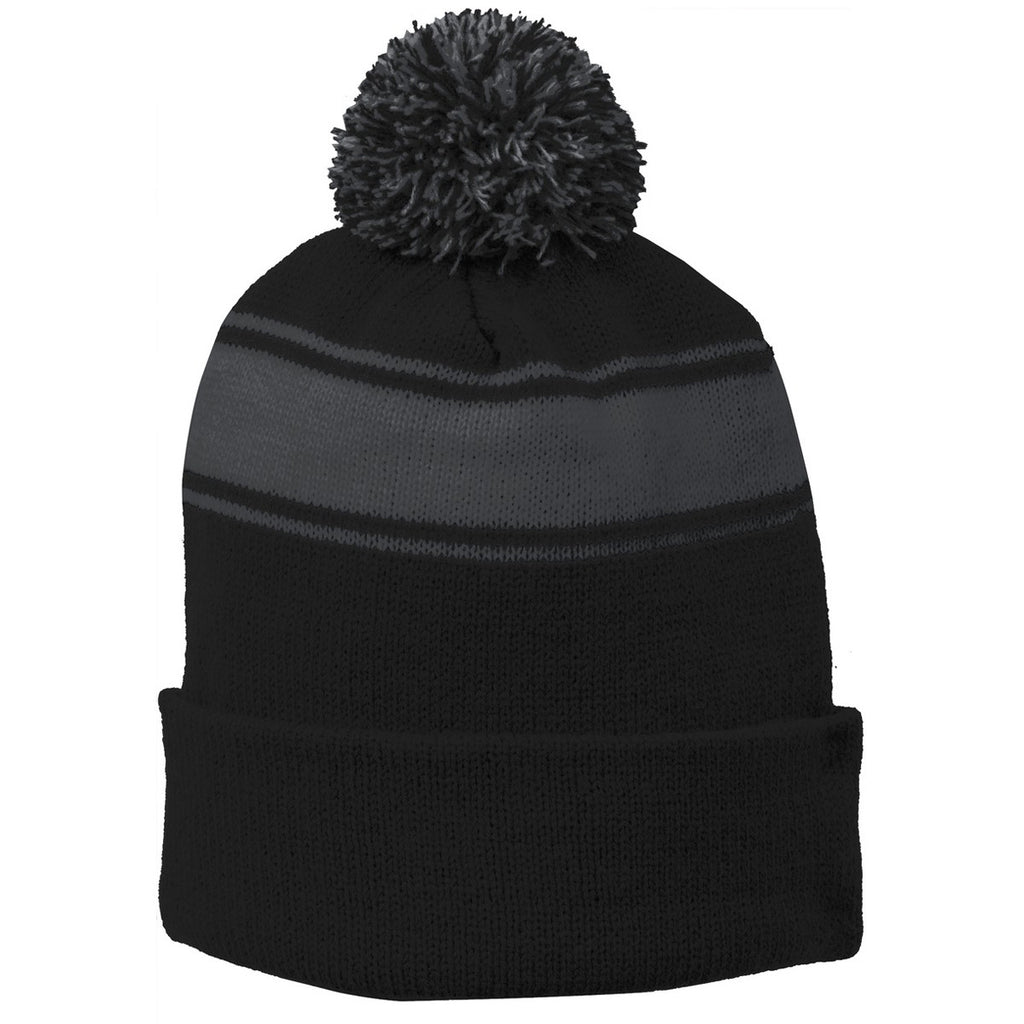 Sport-Tek Stripe Black/Iron Grey Pom Pom Beanie