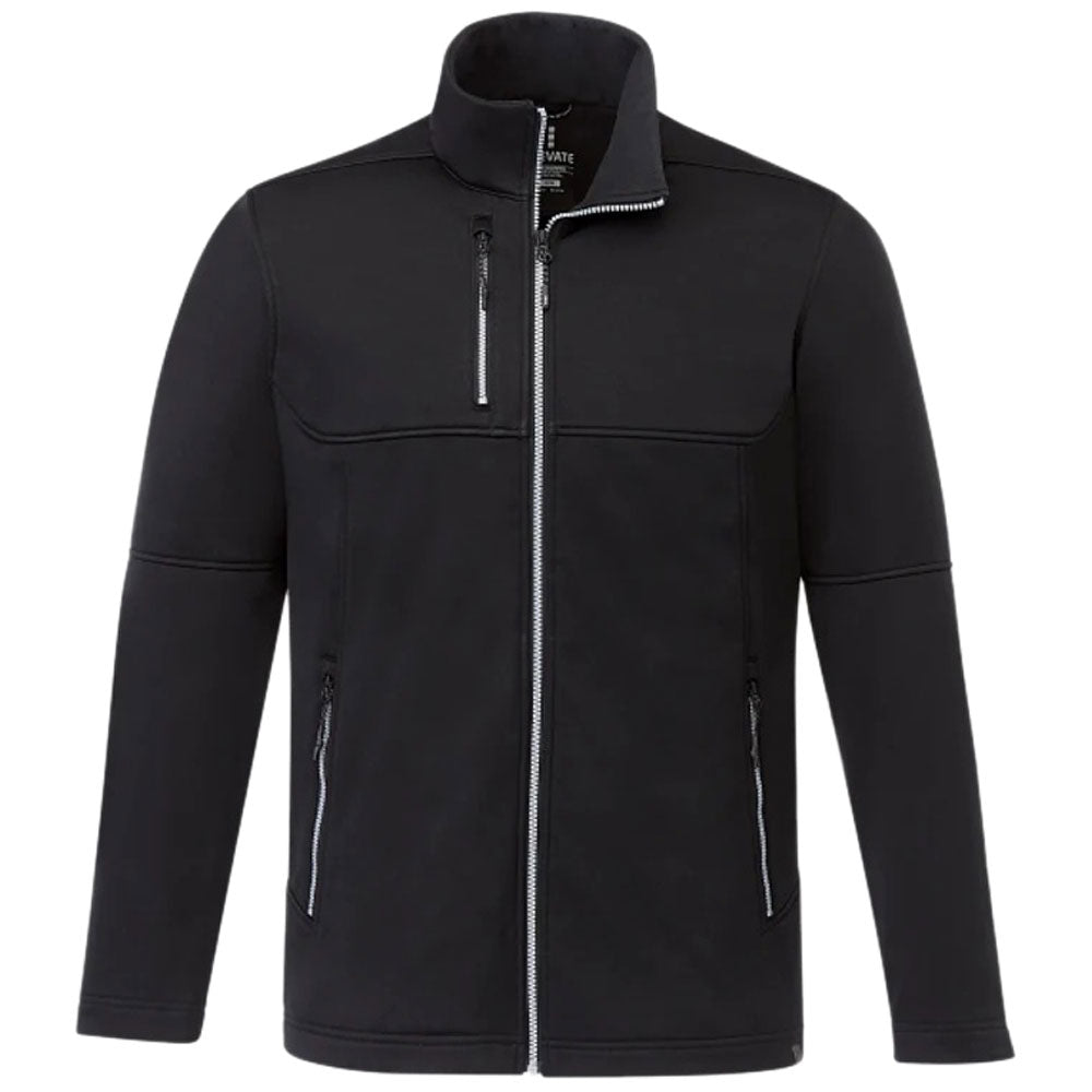Elevate Men's Black Joris Eco Softshell Jacket with custom embroidery looks out for the wearer and the planet as it is created from recycled polyester and has a no contact keychain to keep you from touching buttons and keypads. The breathable, lightweight jacket is great for any weather and keeps valuables safe in zippered pockets. Place an order today.Corresponding Women's Style: Elevate Women's Black Joris Eco Softshell Jacket