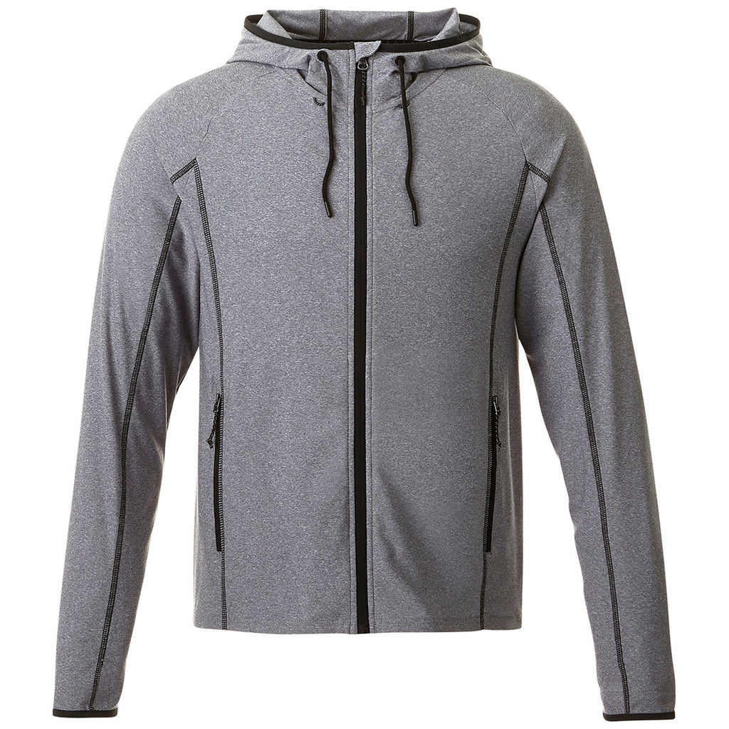 The logoed Elevate Men's Medium Heather Grey Kaiser Knit Jacket is a delightful mix of comfort and style. Four vibrant colors are yours for the choosing, allowing you to find the ideal color tone to match your company logo perfectly. The embroidery jacket has welcome features such as a comfortable textured jersey knit, streamlined fit, attached hood with drawstrings, two outer zippered pockets and interior pocket for keeping items extra safe. Place your corporate logo on the outside of the jacket, which will make a great gift at recruiting events and trade shows.Corresponding Women's Style: Elevate Women's Medium Heather Grey Kaiser Knit Jacket