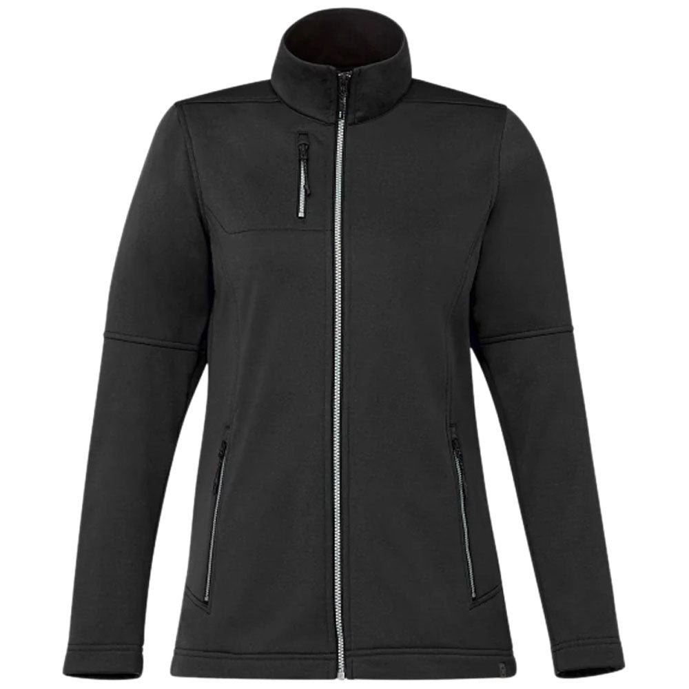 Choose a custom embroidery for the Elevate Women's Black Joris Eco Softshell Jacket to help yourself and the planet. Made from recycled polyester the jacket features a no touch keychain to keep you from having to touch keypads and buttons. Multiple zippered pockets keep valuables safe as you head to the office, the gym, or to hang with friends. Place an order today.Corresponding Men's Style: Elevate Men's Black Joris Eco Softshell Jacket