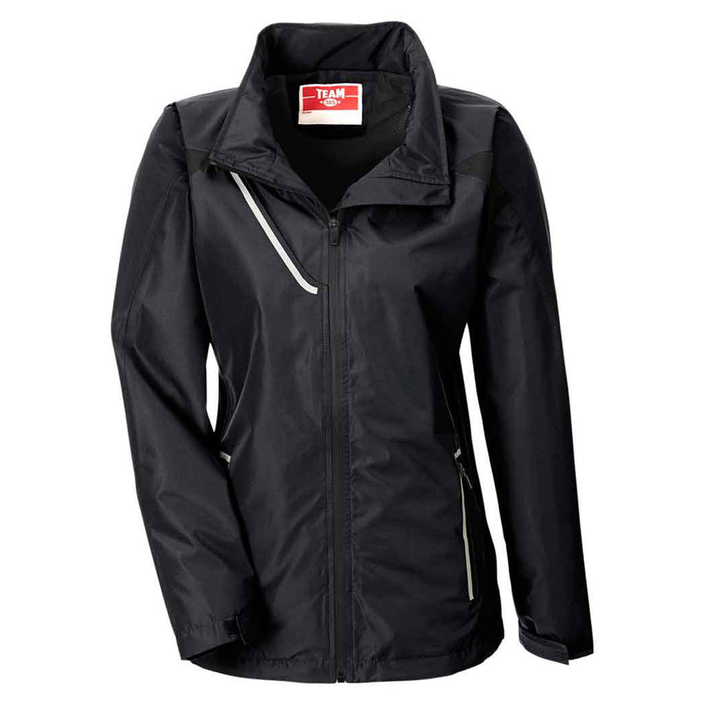 Velcro hem closures at the cuffs and an elastic shock cord give the Team 365 Women's Black Dominator Waterproof Jacket a performance edge over other types of jackets. With a high waterproof rating, the sleek jacket ensures outdoor enthusiasts remain comfortably dry throughout a rainy day. The breathable 100% polyester shell contains micro mesh lining that circulates air to cool the body. Reflective tape located at the front chest pockets gets you noticed at professional networking events. Add your company logo on the large imprint area to take advantage of the attention given by your professional peers.Corresponding Men's Style: Team 365 Men's Black Dominator Waterproof Jacket