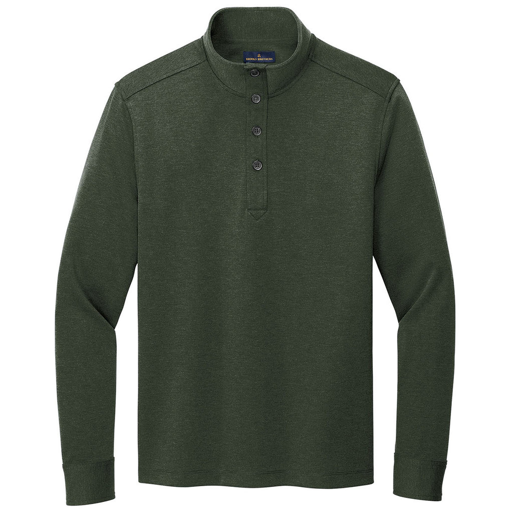 Design a custom embroidery for the Brooks Brothers Men's Pine Heather Mid-Layer Stretch Half Zip for a look that will take you places. The double-knit style is luxuriously soft and forgoes the typical half-zip style for a buttoned vent with a cadet collar. Rounded button cuffs that can be worn long or rolled up. Add a company logo to use as employee gifts or simply enjoy as everyday attire. Order today.
