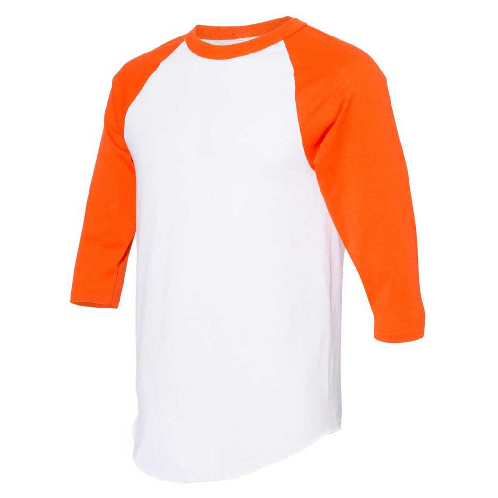 Custom uniforms have never been easier to create than with the Augusta Sportswear Men's White/Orange Three-Quarter Raglan Sleeve Baseball Jersey. This classically designed raglan made of a polyester, cotton blend offers contrasting color rib collar and raglan sleeves for a creative look that will be an instant hit. Add a screen print of your company logo for company-wide events like softball or family games. The double needle hemmed sleeves add extra durability and the surged fishtail bottom provides extra coverage as you slide into home. For a fun twist, add a logo you design to give as gifts or to use as employee apparel where appropriate. Comfort, convenience, and style come together to create this jersey.