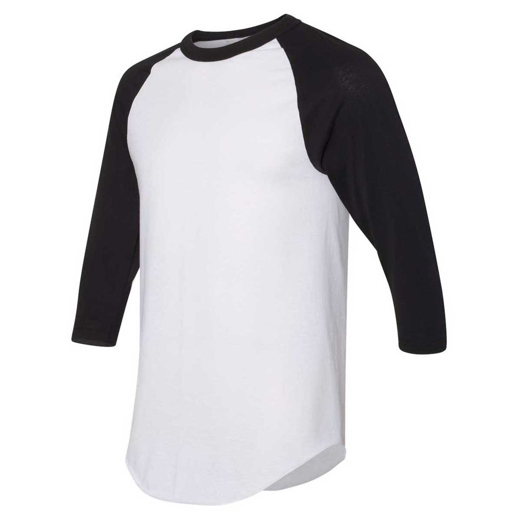 Custom uniforms have never been easier to create than with the Augusta Sportswear Men's White/Black Three-Quarter Raglan Sleeve Baseball Jersey. This classically designed raglan made of a polyester, cotton blend offers contrasting color rib collar and raglan sleeves for a creative look that will be an instant hit. Add a screen print of your company logo for company-wide events like softball or family games. The double needle hemmed sleeves add extra durability and the surged fishtail bottom provides extra coverage as you slide into home. For a fun twist, add a logo you design to give as gifts or to use as employee apparel where appropriate. Comfort, convenience, and style come together to create this jersey.Highlights