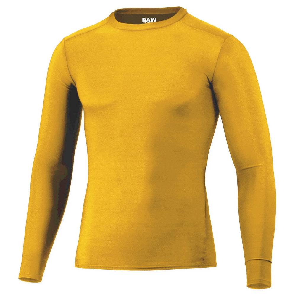 Even the toughest body builders will feel the cool breezes during the fall and winter months. You can keep them comfortable with the BAW Men's Gold Compression Cool Tek Long Sleeve Shirt. Because it is made from polyester and spandex, it is durable and has stretch. Your logo across the front will tell everyone that hard work pays off. This is an ideal incentive gift for employees, customers and potential customers. Like the short sleeve version it has a crew neck with double needle hems. You can choose from popular colors that will help your logo stand out.Highlights