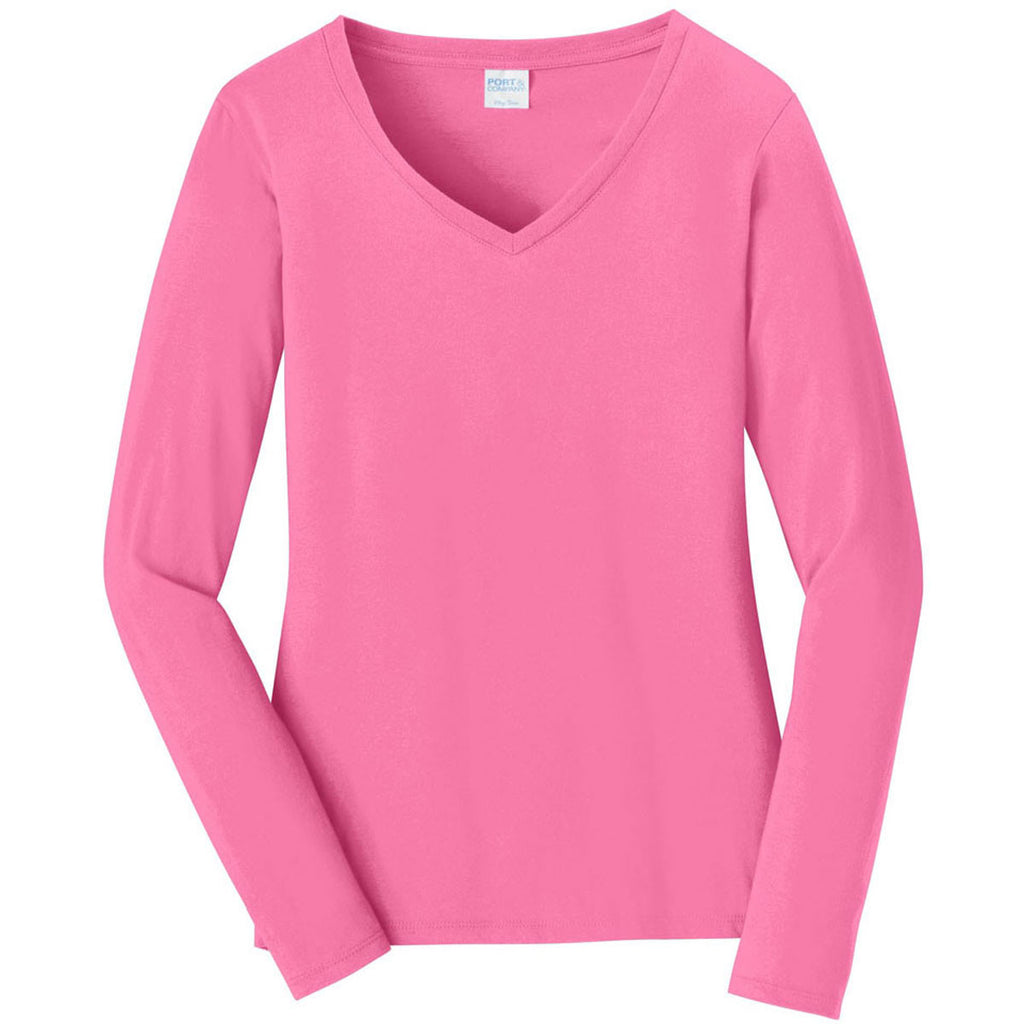 Port & Company Women's New Pink Long Sleeve Fan Favorite V-Neck Tee