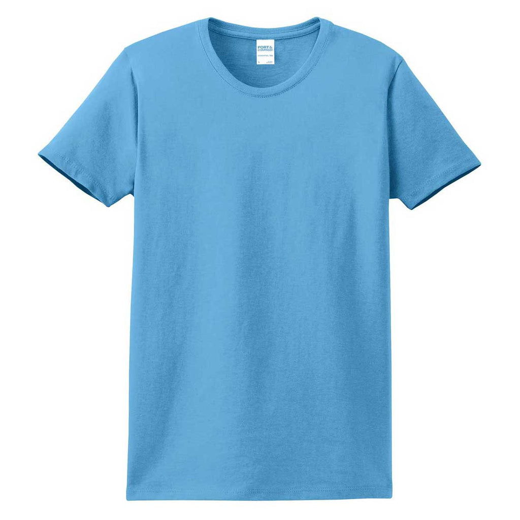 A perennial favorite, this Port & Company Women's Aquatic Blue Essential Tee is crafted from lightweight, soft-spun cotton. Declared as "most popular" by groups and teams across America. Features a shorter midriff and sleeves for a more feminine fit. Emblazon this crew neck tee with your company's logo or message to gift it to your clients as a corporate give-away or a summer uniform staple for your employees. Either way, it will help your company or organization stand out and create an impactful brand identity.Highlights