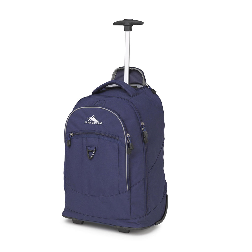 The High Sierra True Navy Chaser Wheeled Backpack makes a versatile promotional item to brand your logo because it fits so many different events and customers including but not limited to school, outdoor and sports. It's shoulder straps and wheels give you the choice of wearing your essentials or pulling them behind you thanks to skate-style wheels and single-tube telescoping handle. This backpack is sure to make your logo more visible on roads, at marketplaces, company events, trade shows and corporate gatherings.Highlights