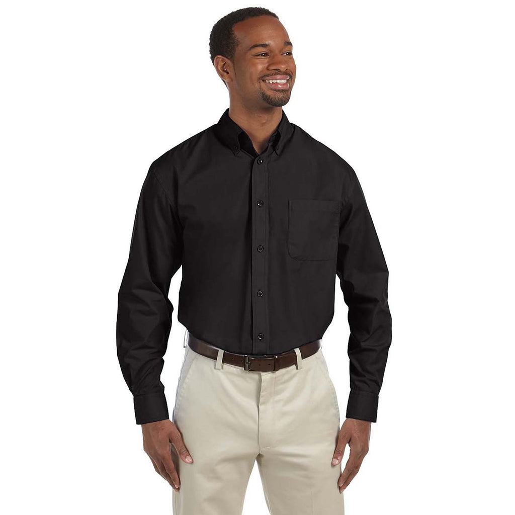 Thirty-five percent cotton poplin gives the Harriton Men's Black 3.1 oz. Essential Poplin its super soft feel. The remaining polyester ensures the stylish shirt resists rips and tears. Extra stitching at the seams and buttons bolster the strength of the long-sleeve shirt. Two-button adjustable cuffs complement the button down collar to create a versatile shirt to wear at the office and during visits to upscale restaurants. The left chest pocket offers convenient storage for a Smartphone. Attach your corporate label to spread the word about your business. Corporate logoed apparel makes ideal gifts for your employees.Corresponding Women's Style: Harriton Women's Black 3.1 oz. Essential Poplin