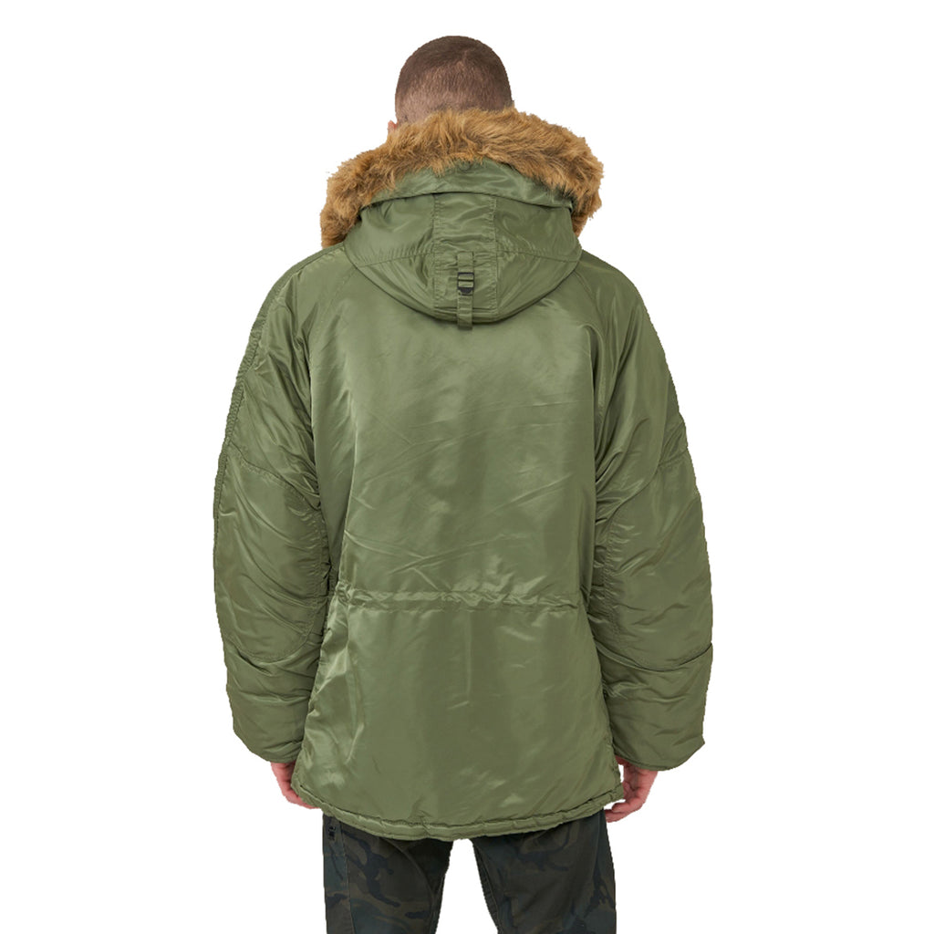 Alpha Industries Men's Sage Green N-3B Parka has been specifically created for extreme cold weather with water resistant covering, a snorkel hood with removable faux fur around the hood, and faux mouton lined hood. Add your company logo or embroidery to use these as employee gifts or apparel. Created so beautifully with channel quilted lining and sleeve shirring this parka could easily serve as fashion apparel for those who want to look great and stay warm. Little extras such as interior and exterior pockets, hand warmer pockets, and ottoman knit cuffs will make this functional parka an instant favorite. Place your order right away.Highlights