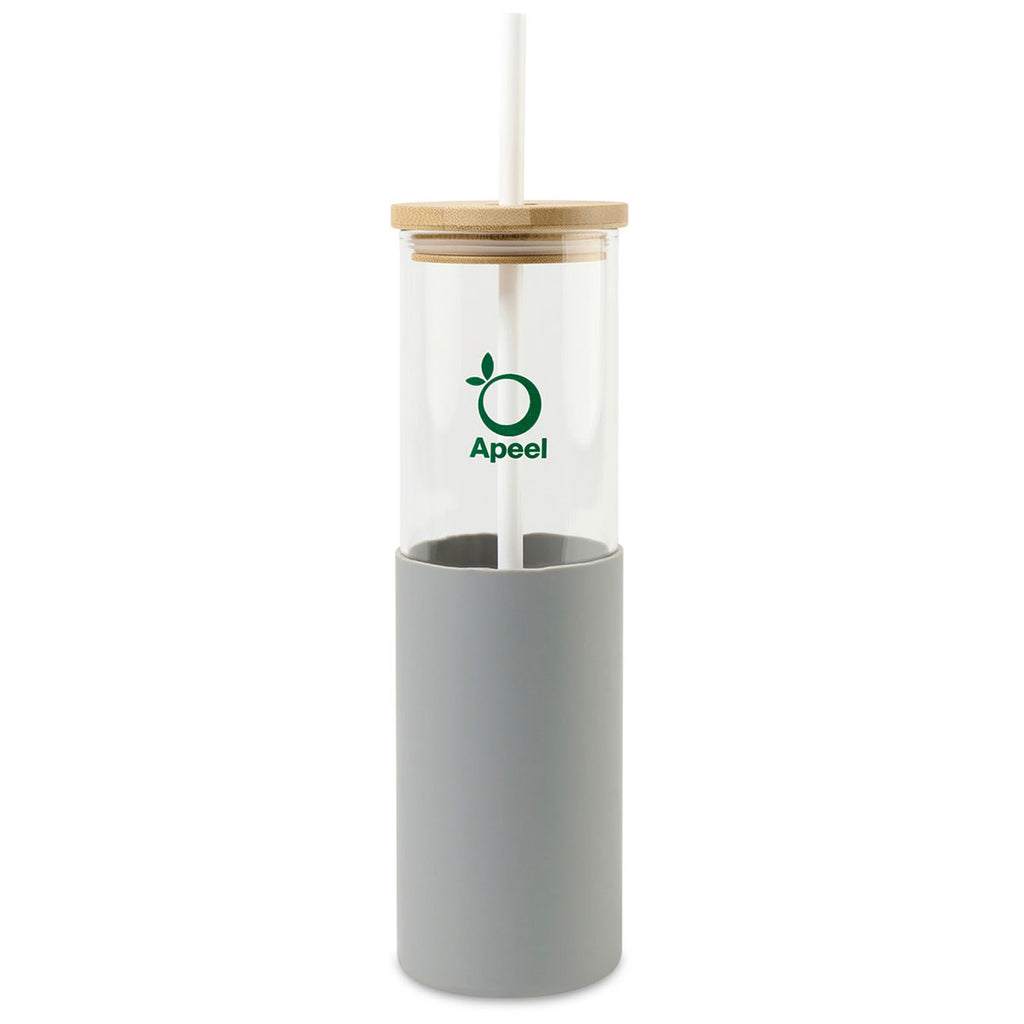The Aviana Dove Grey Journey Glass Tumbler with Straw - 20 Oz is the perfect way for clients, colleagues, and customers to show off your company's custom logo wherever they go. This on-trend tumbler features on-trend touches like a contrast silicone sleeve, screw top bamboo lid, and reusable straw.