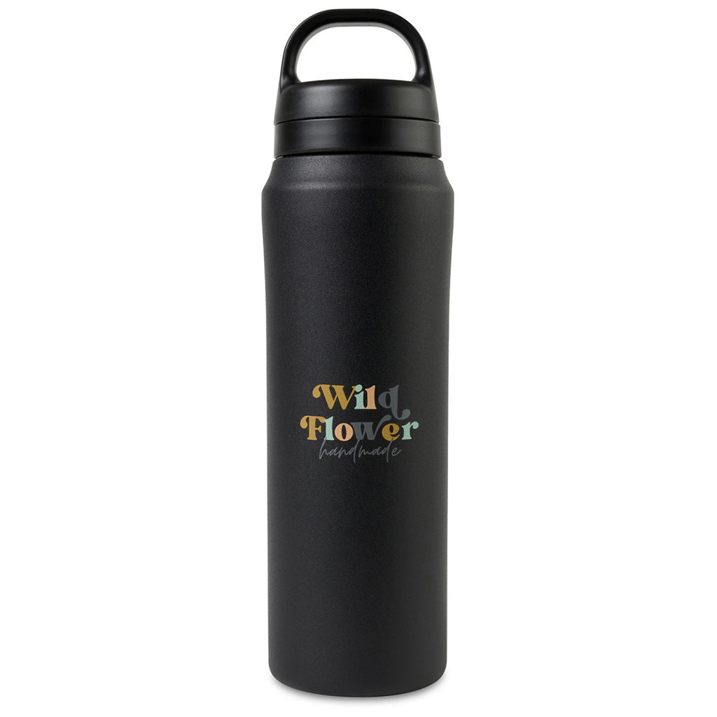 Aviana Black Rowan Recycled Water Bottle - 16 Oz. with a custom logo creates a cute product option to share with friends, family, and customers. The smaller bottle is great for short hikes, school, or the office to help you stay hydrated throughout the day. The convenient top handle allows this to be clipped to a backpack or tote as needed.