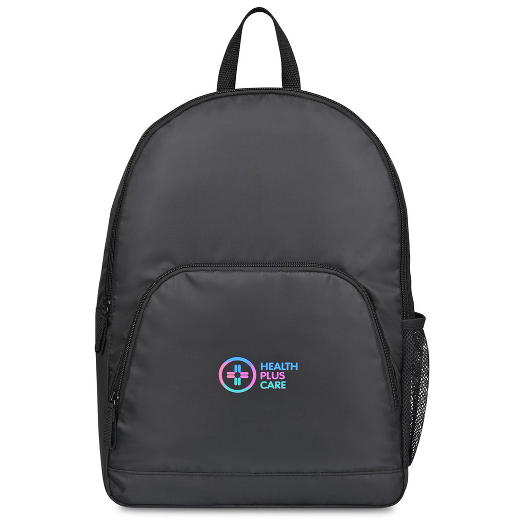 Try a corporate logo for the Gemline Black Repeat Lite Recycled Poly Backpack to create an easy-to-carry look that helps with organization. The roomy main compartment is ideal for books, files, or smaller electronics, and the front zippered pocket holds your keys, phone, and anything else you need at hand. Order for work, school, or as gifts.