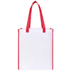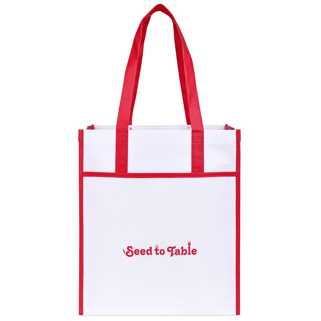 Add your corporate logo to the Gemline Red Harlow Laminated Recycled Shopper with colorful accents to be more eco-conscious while grocery shopping, running errands, or just shuttling the kids from place to place. These large bags with a roomy main compartment and extra front slash pocket are easy to use and then fold up for storage.The minimum order for this product is 150 pieces.