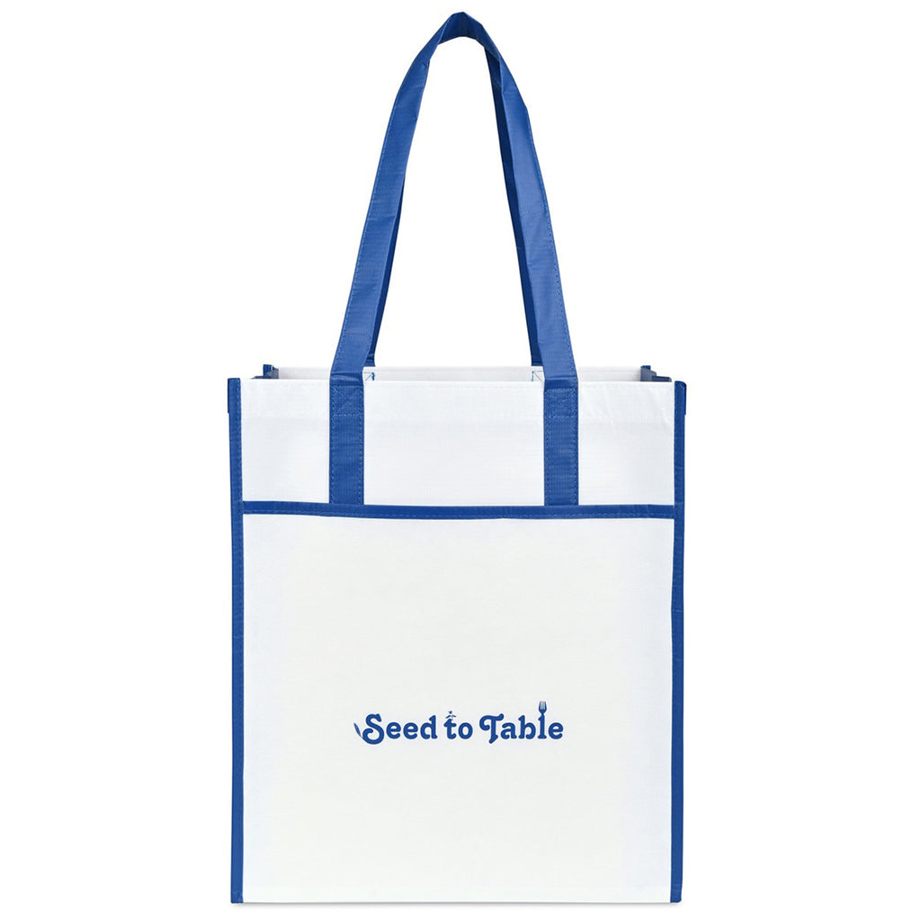 Add your corporate logo to the Gemline Royal Blue Harlow Laminated Recycled Shopper with colorful accents to be more eco-conscious while grocery shopping, running errands, or just shuttling the kids from place to place. These large bags with a roomy main compartment and extra front slash pocket are easy to use and then fold up for storage.The minimum order for this product is 150 pieces.