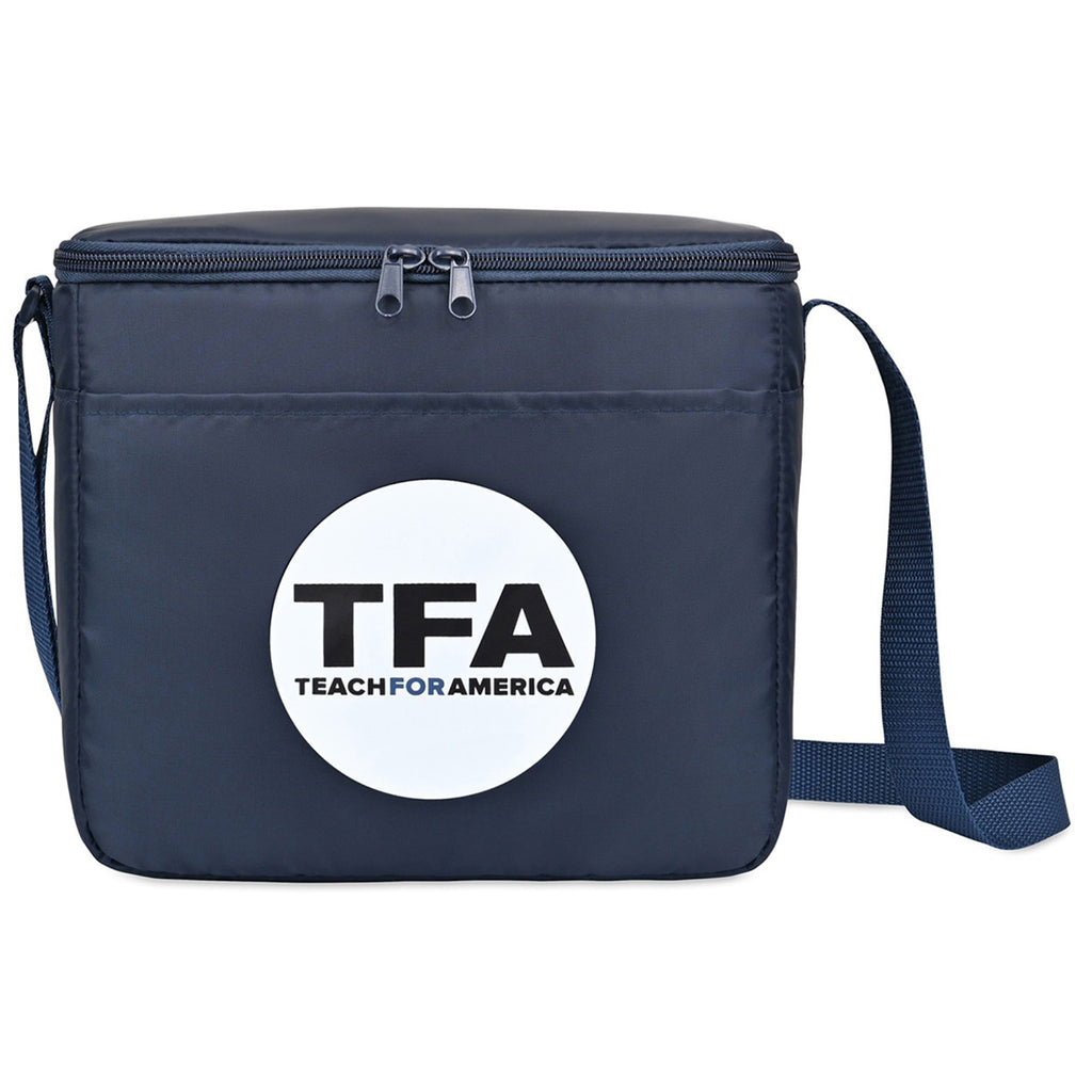 Gemline Navy Arlo rPET 9 Can Box Cooler with a corporate logo is a perfect promotional item that will be used on all types of adventures. Whether going to a sporting event, hiking, or to a picnic in the park, this box cooler has a zippered main opening and a front pocket for a few extra snacks or your phone and keys.