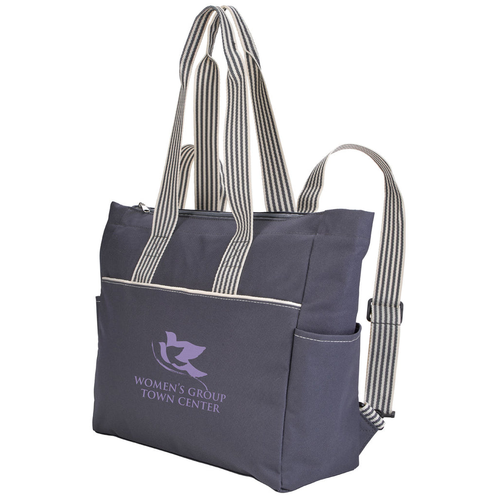 The Atchison Grey Stripe Diaper Tote-Pack is a must-have for today's modern parents. Featuring awesome extras like a striped changing pad, add your company's custom logo or design to the exterior for a thoughtful item that will make an unforgettable employee gift for anyone on your team who is expecting.