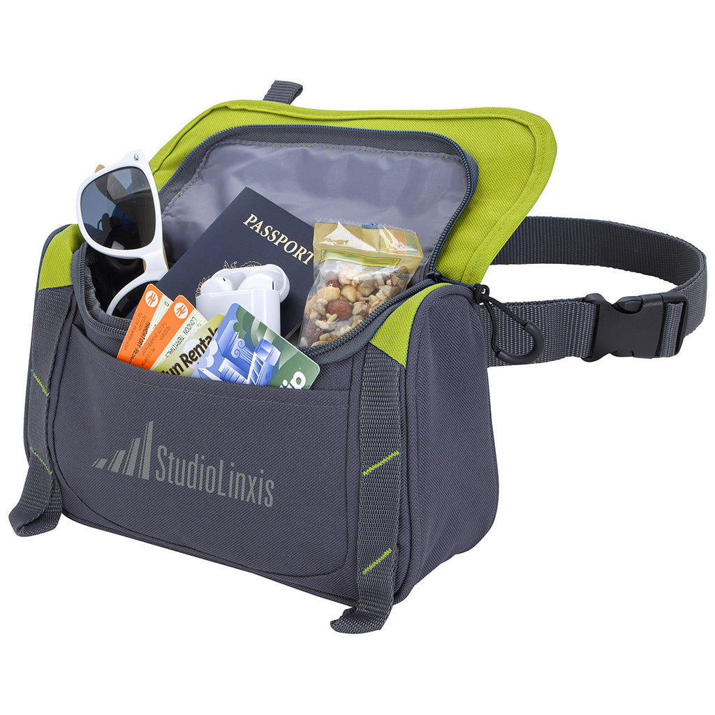 All-around Adaptive RPET Fanny Pack with a custom logo is the perfect option for parents or assistants on the go. This pack has four different ways to be utilized with a wide-open zippered front compartment, front slip pocket, daisy chains and adjustable wrist strap. Great as a gift or for yourself. Order today.