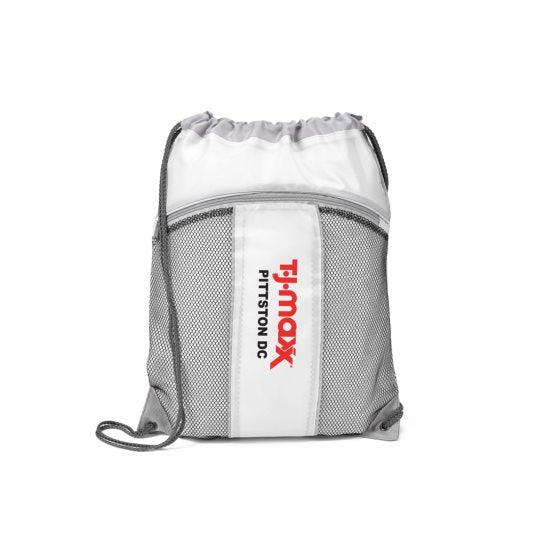 - 210D polyester, two tone mesh and nylon drawstring bag with front zippered pocket