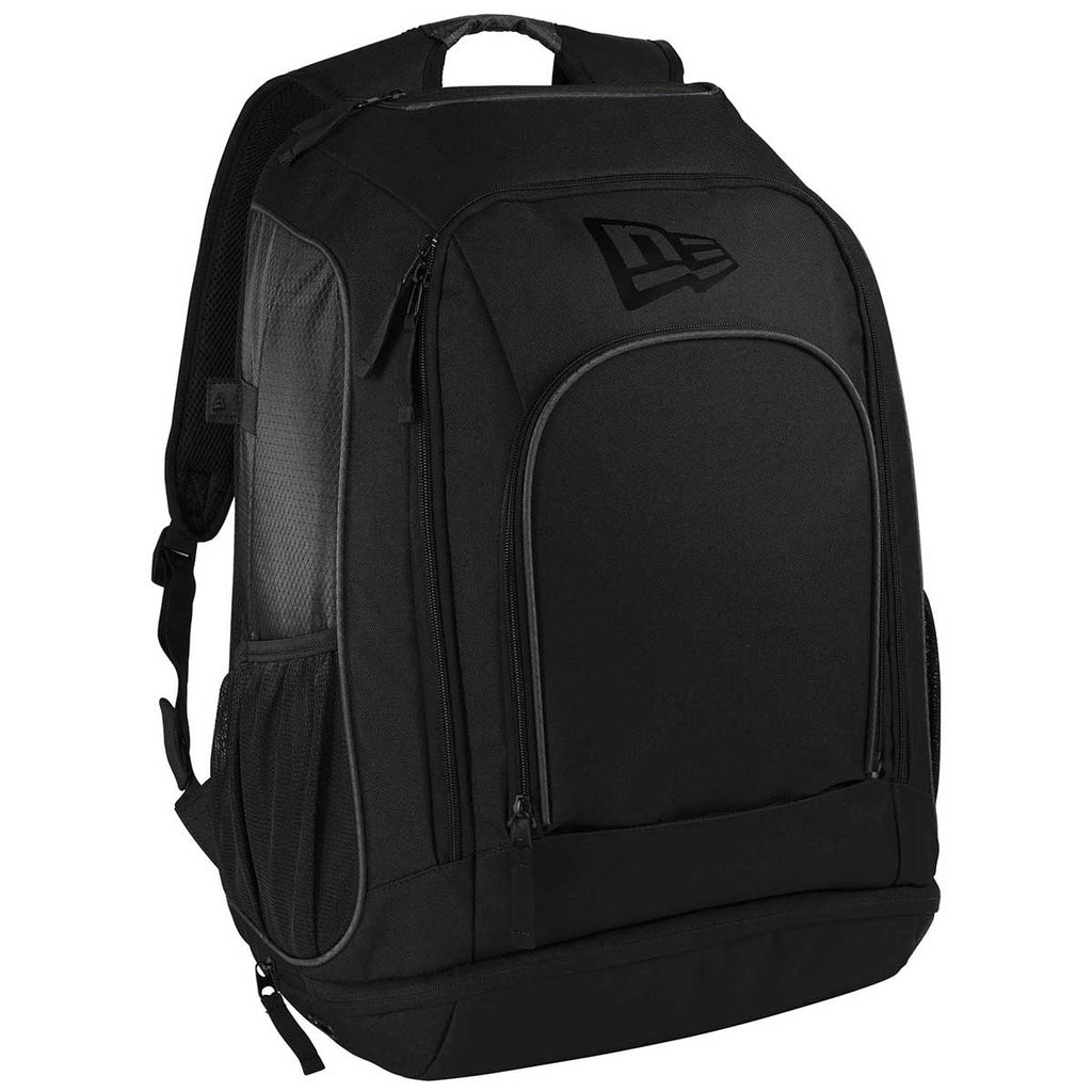 Make a bold statement with a custom New Era Graphite/Black Shutout Backpack. Created for athletes and team events this backpack offers a large, dedicated main compartment for helmets. Add a custom logo to show team spirit and pride on the polyester and diamond dobby ripstop. Your embroidery will stand out against the chosen color combination that makes up this backpack. Perfect as an end of the year gift for those who have worked hard all season, this backpack has heavy double stitched webbing on the top grab handle, a lined, zippered valuables pocket, and a front compartment organizer with a key fob for this most important item. The vented shoe compartment and water compartment mean all your items are easily accessible.