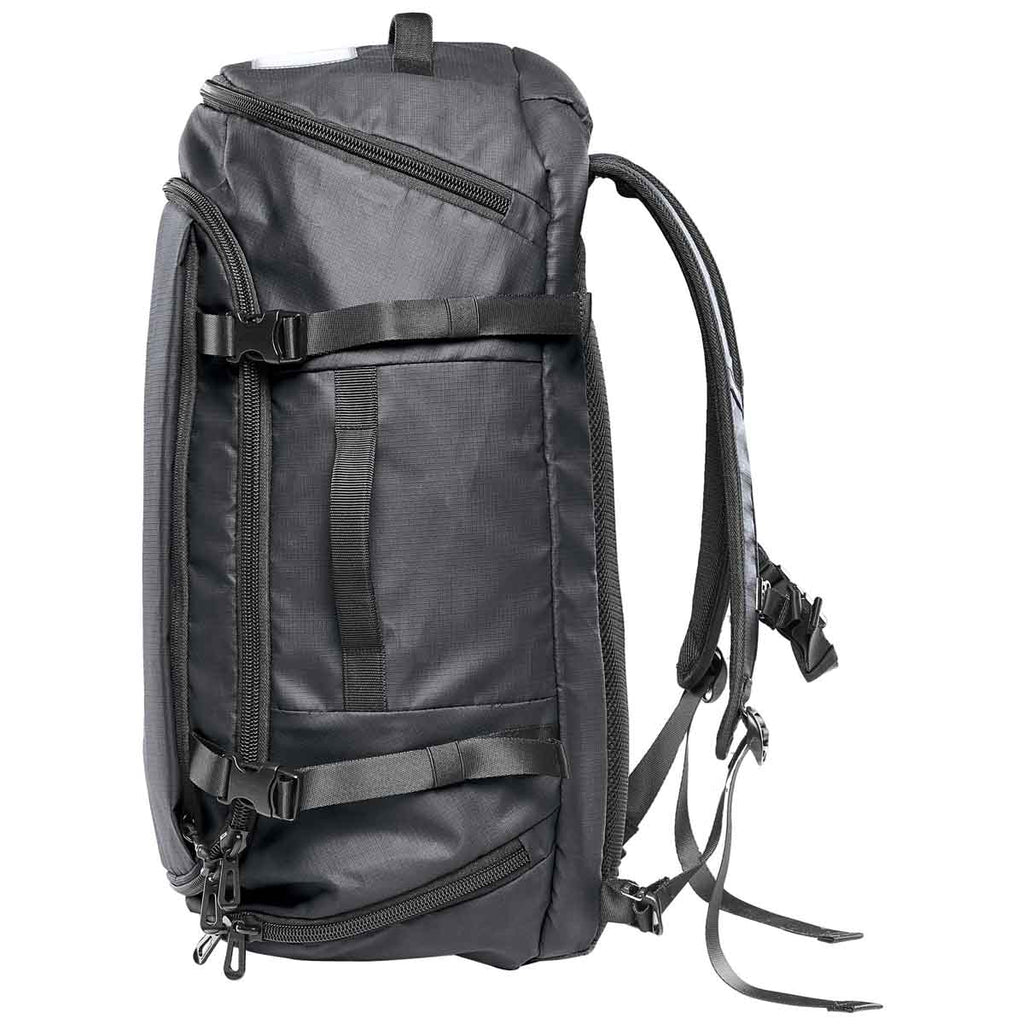 Choose embroidery for the Stormtech Graphite Madagascar Duffle Pack for a bag that goes anywhere you want to be. This highly versatile piece of luggage is great for the weekend traveler, but can be used as a backpack when hiking or camping in the wilderness. The large, main zippered compartment has generous pocket space with an interior zippered mesh pocket for organization. Add a custom logo to give these as employee gifts or to hard workers in the company. To switch to the backpack option, simply adjust the ergonomic shoulder straps or just grab the side carry handles when in a hurry. Two full access zippered pockets are great for shoes.Highlights