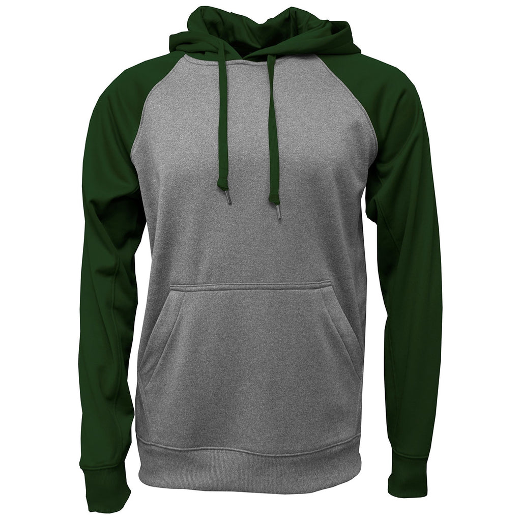 Give a logoed fleece that men will really like to wear. This model might make them feel like Rocky Balboa plus with your company logo they will certainly feel like a winner! The BAW Men's Heather Black/Dark Green Raglan Sleeve Fleece Hooded is made from heathered polyester Thermo-Tek so it is truly cozy and comfortable. It is fully cover-seamed, and has a dyed to match draw cord. It features a front pouch pocket with hidden media pocket for convenience. Sizes available from S to 4X. The front and back are solid grey which will make your logo stand out better. The sleeves and hood are in contrasting colors.Highlights
