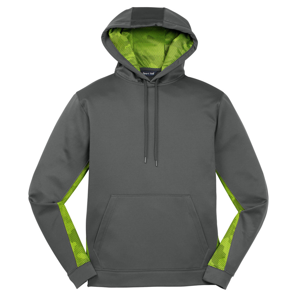 When the weather gets tough, so must you. That's the idea behind this Sport-Tek Men's Dark Smoke Grey/ Lime Shock Sport-Wick CamoHex Fleece Colorblock Hooded Pullover. Add your own custom embroidery to make this a piece of corporate apparel that anyone can enjoy. Layering is ideally suited to serve as your canvas, and this is an item that will work for you in the elements, not against.Highlights