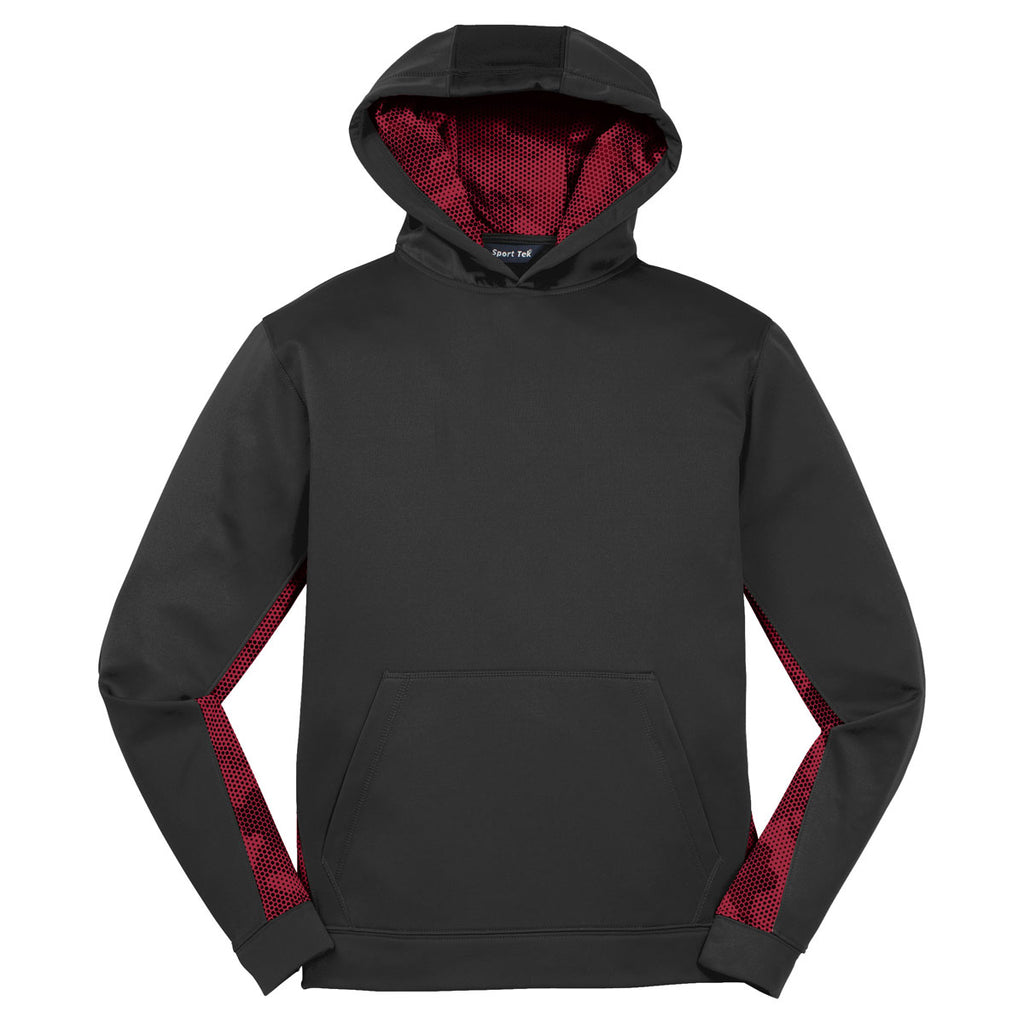 When the weather gets tough, so must you. That's the idea behind this Sport-Tek Youth Black/Deep Red Sport-Wick CamoHex Fleece Colorblock Hooded Pullover. Add your own custom embroidery to make this a piece of corporate apparel that anyone can enjoy. Layering is ideally suited to serve as your canvas, and this is an item that will work for you in the elements, not against.