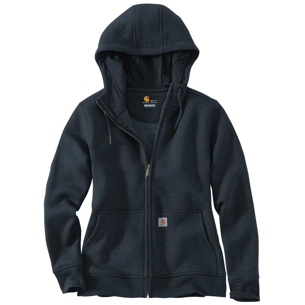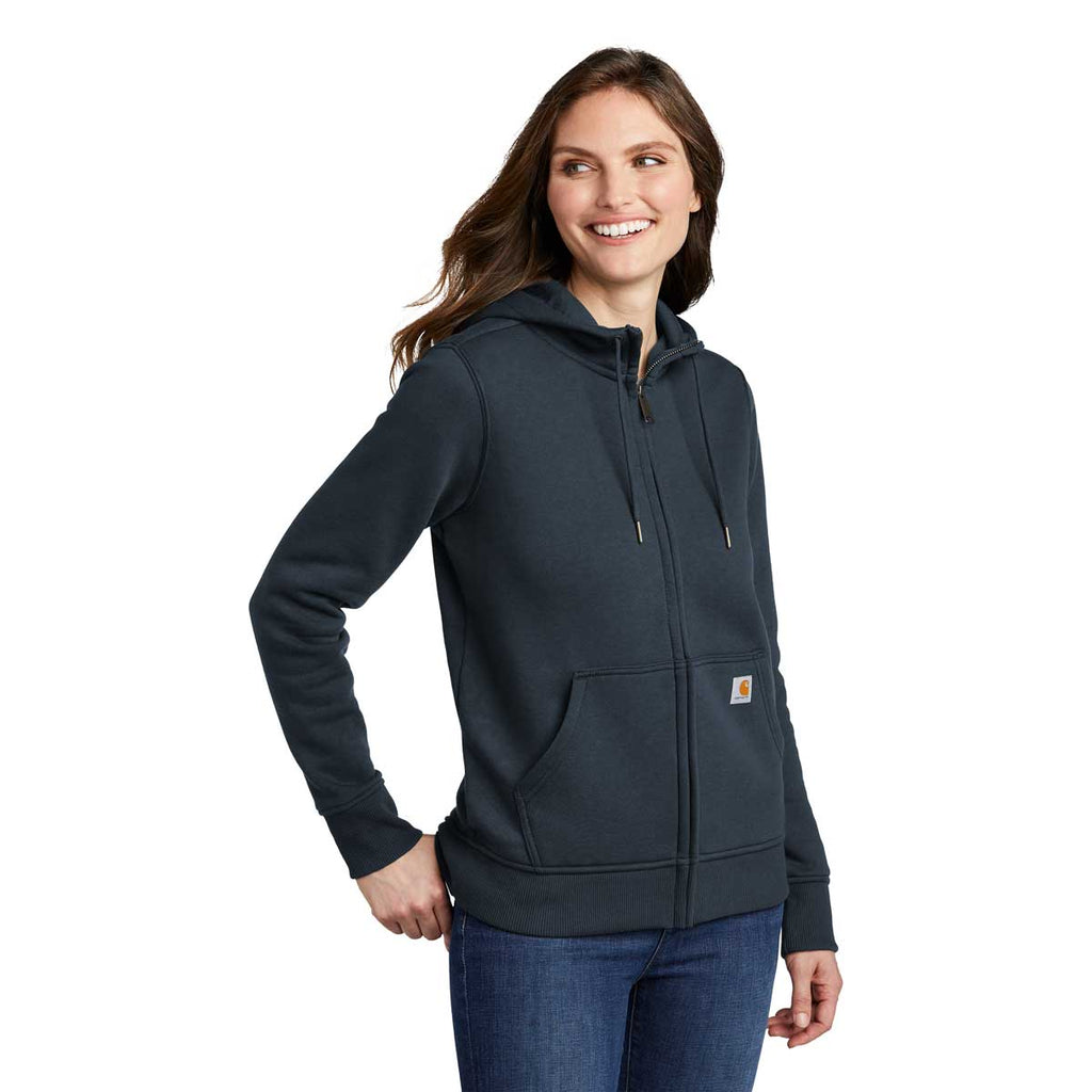 Add embroidery to the Carhartt Women's Navy Clarksburg Full Zip Hoodie for a workwear look that is both durable and gorgeous. When you spend time outdoors you need something that will stand up to tough days and this cotton poly blend is tough enough. The best part is a soft feel on the interior, like a favorite sweatshirt that would make a great custom gift with the logo of your choice. The stretchable, spandex-reinforced, rib knit cuff and waistband has a relaxed fit that does not look sloppy. Add a company logo to use as employee gifts or apparel that can be worn daily or as needed.