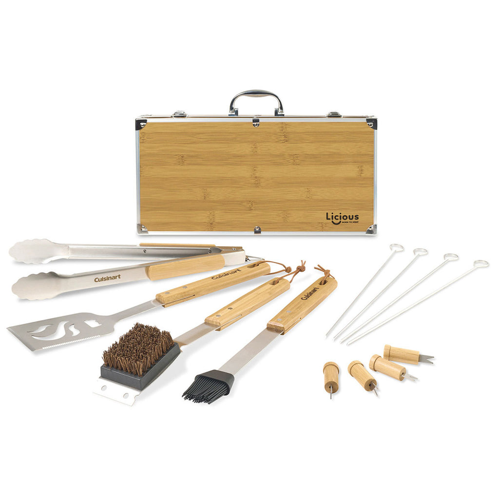 Create an unforgettable personalized gift by adding your company's custom logo to the Cuisinart Bamboo Bamboo 13 PC Grill Tool Set. Great for tailgates, campsites, retreats, or celebrating the purchase of a home, this kit comes complete with 13 grilling tools crafted from a combination of stainless steel and riveted bamboo.