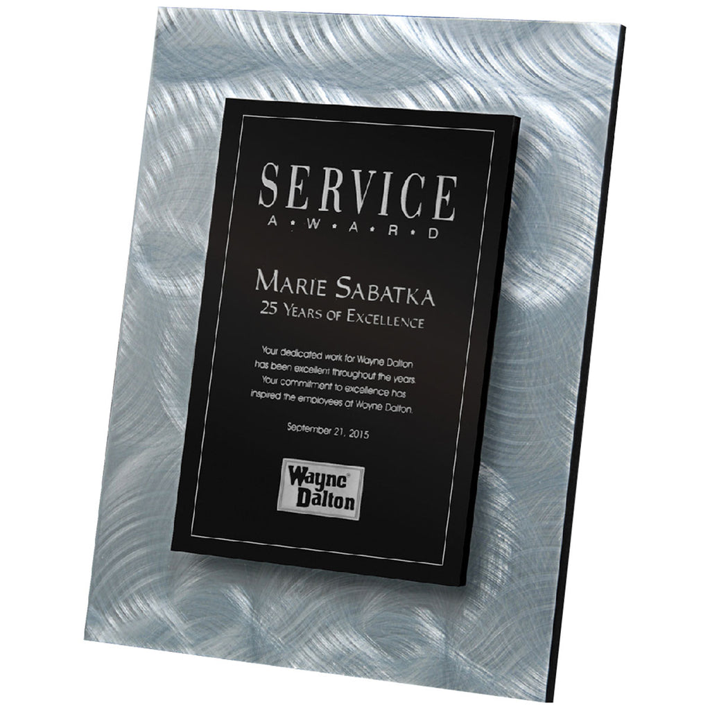 Show appreciation with a corporate logo on the Hit Silver Wall Plaque. The laser-engraved plaque is made of a black plastic backer with a silver swirl and a black aluminum plate that looks lovely against almost any surface. These are easy to print and share for milestones in your company or organization.