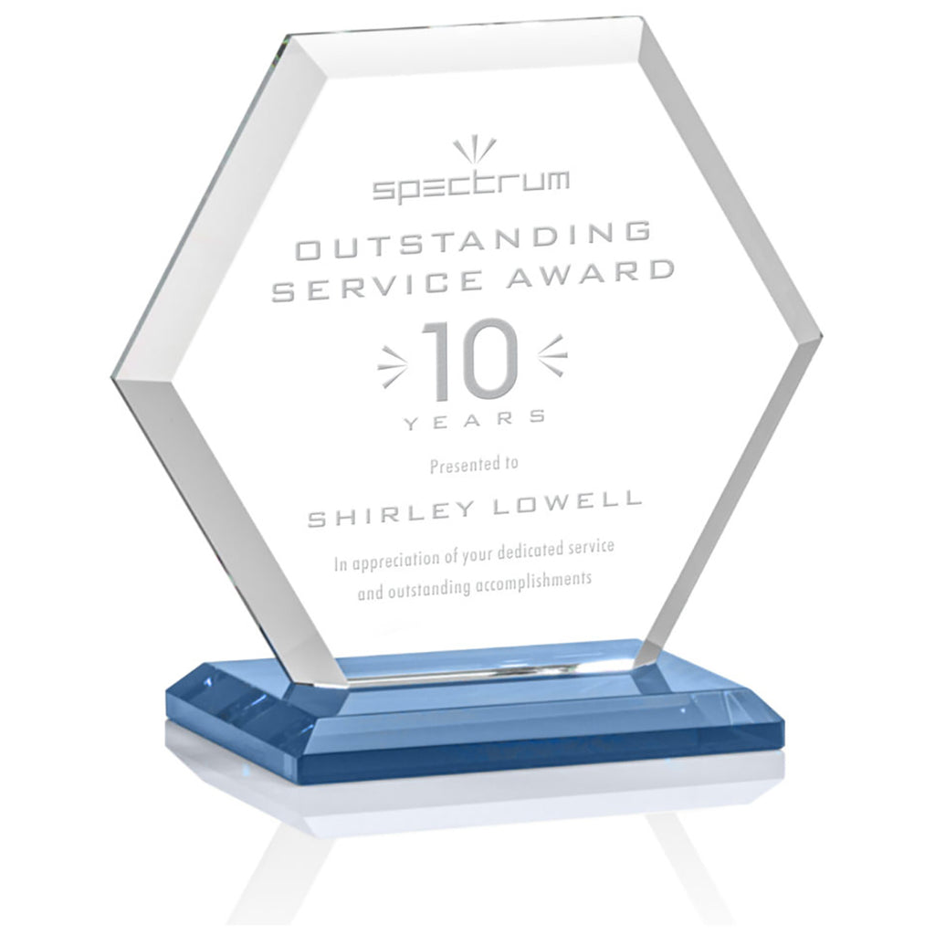 St. Regis Light Blue Barnett Award 5" x 5.25" x 3" - Laser Engraved with a custom message comes in multiple sizes to fit your special awards ceremony needs. The beveled Starfire Crystal hexagon is mounted on your choice of bases. Perfect to recognize outstanding service, anniversaries, or anything you choose. Order before your next event.The minimum order for this product is 1 piece.