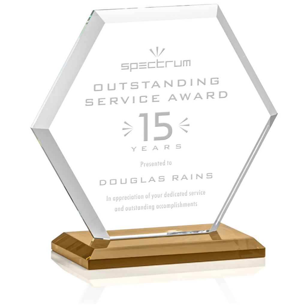 St. Regis Amber Barnett Award 6" x 6.25" x 3" - Laser Engraved with a custom message comes in multiple sizes to fit your special awards ceremony needs. The beveled Starfire Crystal hexagon is mounted on your choice of bases. Perfect to recognize outstanding service, anniversaries, or anything you choose. Order before your next event.